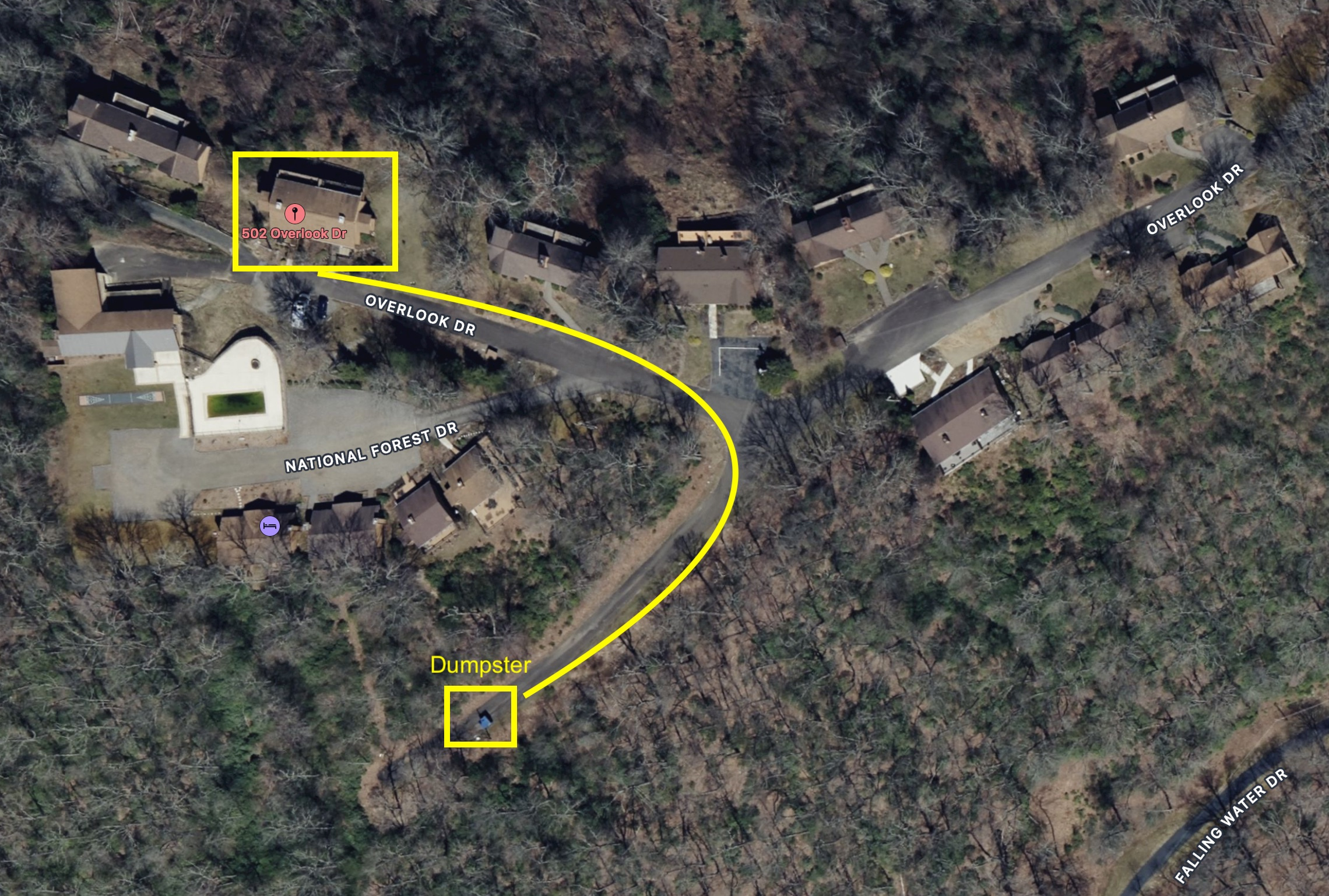 During the regular resort season a dumpster is available for guests to use for trash disposal. It is located on Fawn Way which is out the front door, to the left 100' or so and on your right. It is marked with a street sign. The dumpster opens on May 1st each season. There is a lock on the dumpster. The combination for it is 2020. If the lock sticks, push it in the "closed" direction firmly and then pull in the "open" direction and it should pop open.